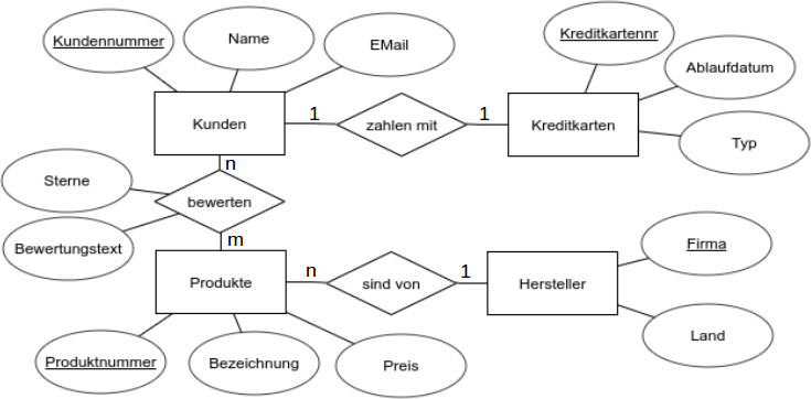 Ich habe das Diagramm mit dem Online-ER-Diagramm-Generator ERDPlus erstellt. Leider verwendet ERDPlus nicht die 1/n/m-Syntax für Beziehungstypen. Daher habe ich diese Annotationen einfach nachträglich hinzugefügt.